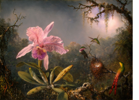 In the painting there is a orchid and three humming birds. The colors that Heade used were cool and warm colors. There are dead branches and moss that dips from the trees. In the distance jungle there is a blue-gray mist, with a brighter purple-pink light on the right.