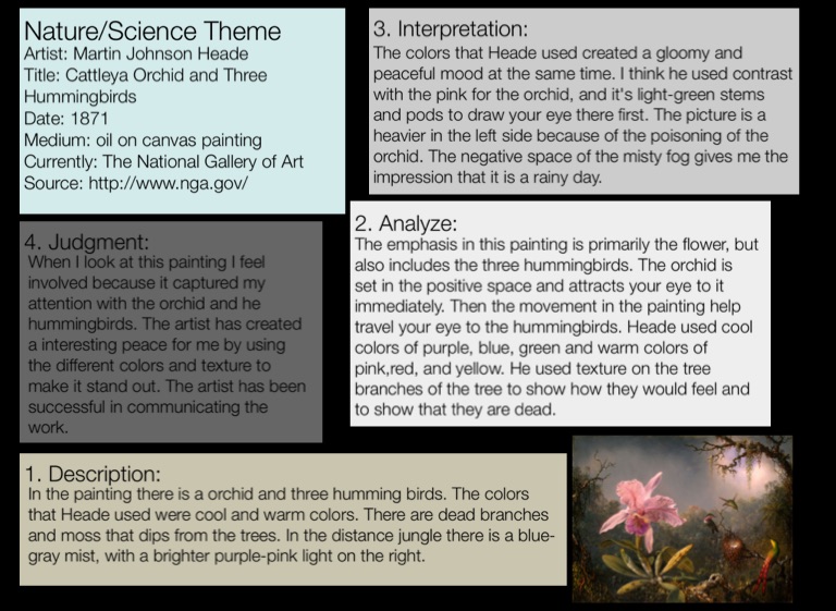 When I look at this painting I feel involved because it captured my attention with the orchid and he hummingbirds. The artist has created a interesting peace for me by using the different colors and texture to make it stand out. The artist has been successful in communicating the work.