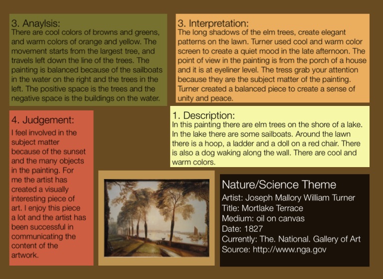 The long shadows of the elm trees, create elegant patterns on the lawn. Turner used cool and warm color screen to create a quiet mood in the late afternoon. The point of view in the painting is from the porch of a house and it is at eyeliner level. The tress grab your attention because they are the subject matter of the painting. Turner created a balanced piece to create a sense of unity and peace.