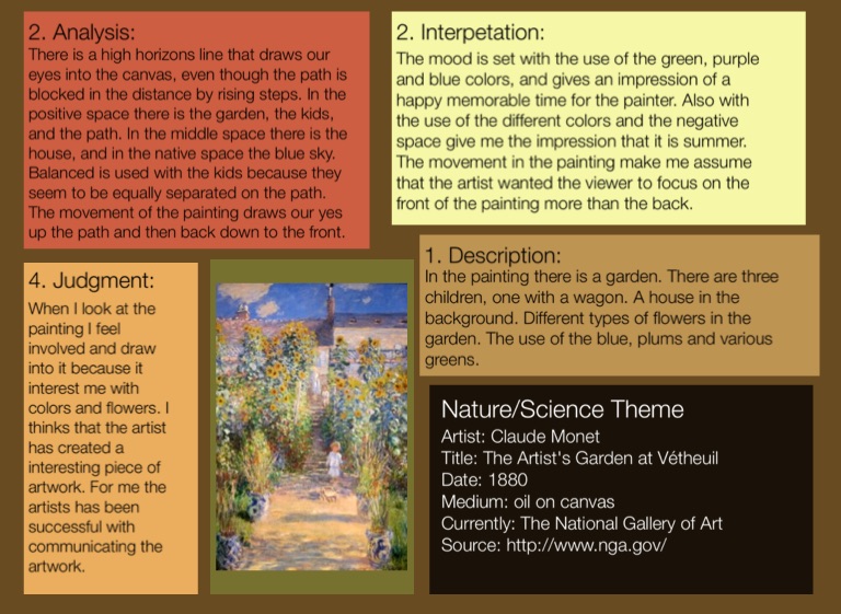 There is a high horizons line that draws our eyes into the canvas, even though the path is blocked in the distance by rising steps. In the positive space there is the garden, the kids, and the path. In the middle space there is the house, and in the native space the blue sky. Balanced is used with the kids because they seem to be equally separated on the path. The movement of the painting draws our yes up the path and then back down to the front.