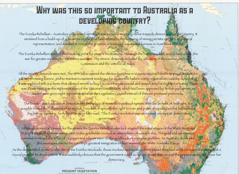 All the miner’s demands were met. The 1854 bill to extend the elective franchise in Victoria required miners to pay 8 pounds for a 12 month mining licence, and to maintain consistent residency for six months before voting registration could be considered. It was replaced with a scheme that allowed miners to buy a licence for one pound and immediately be eligible for voting. There was a vast impact on the implementation of the Victorian Constitution, which had been approved by British parliament, as miners were given eight representatives on the Legislative Council instead of the one promised previously.