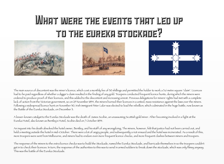 A lesser-known catalyst to the Eureka Stockade was the death of James Scobie, an unassuming Scottish gold miner. After becoming involved in a fight at the Eureka Hotel, also known as Bentley's Hotel, Scobie died on 7 October 1854.