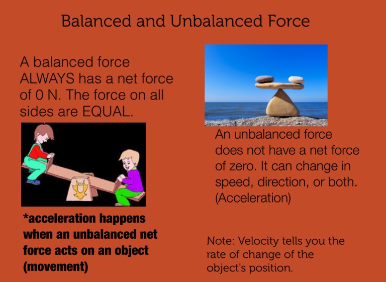 An unbalanced force does not have a net force of zero. It can change in speed, direction, or both. (Acceleration)