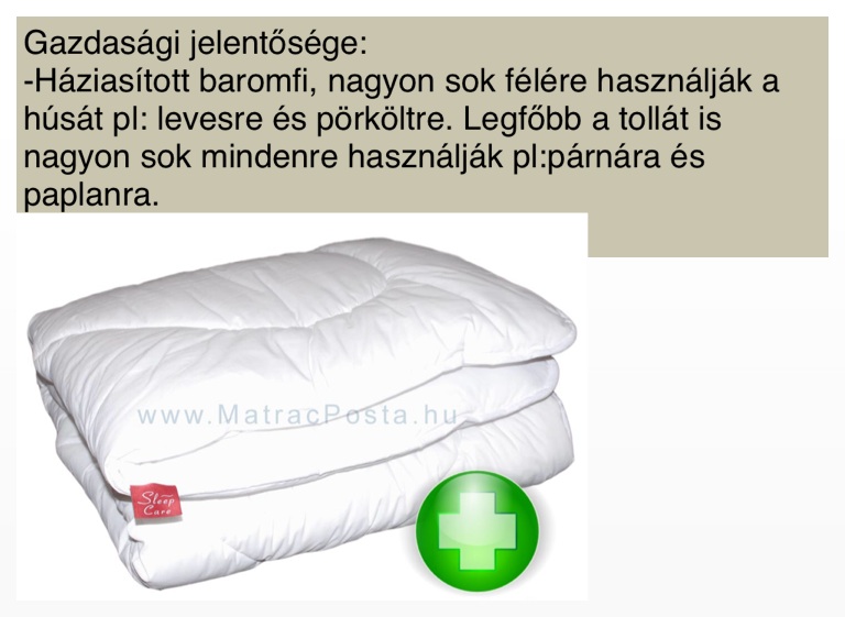 -Háziasított baromfi, nagyon sok félére használják a húsát pl: levesre és pörköltre. Legfőbb a tollát is nagyon sok mindenre használják pl:párnára és paplanra.