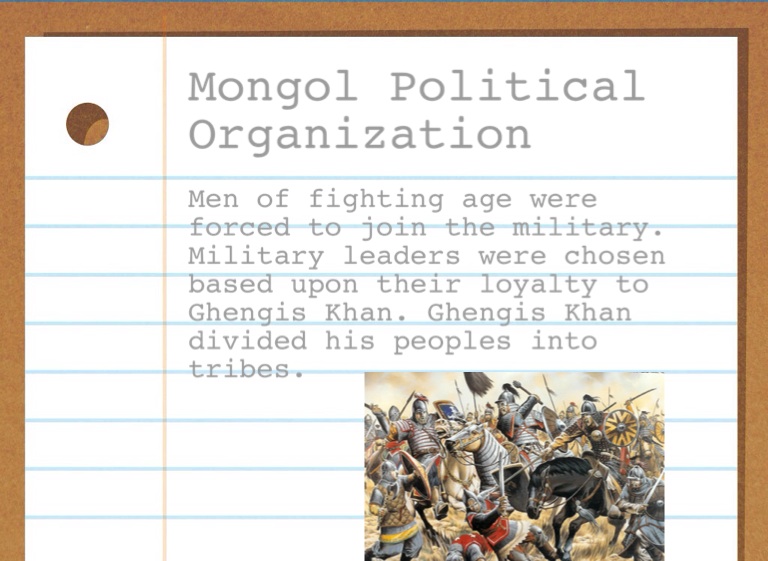 Men of fighting age were forced to join the military. Military leaders were chosen based upon their loyalty to Ghengis Khan. Ghengis Khan divided his peoples into tribes.