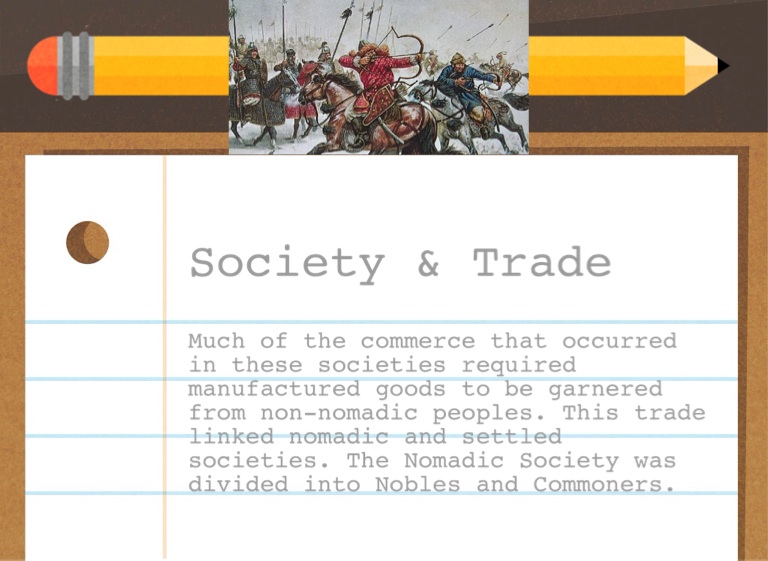Much of the commerce that occurred in these societies required manufactured goods to be garnered from non-nomadic peoples. This trade linked nomadic and settled societies. The Nomadic Society was divided into Nobles and Commoners.