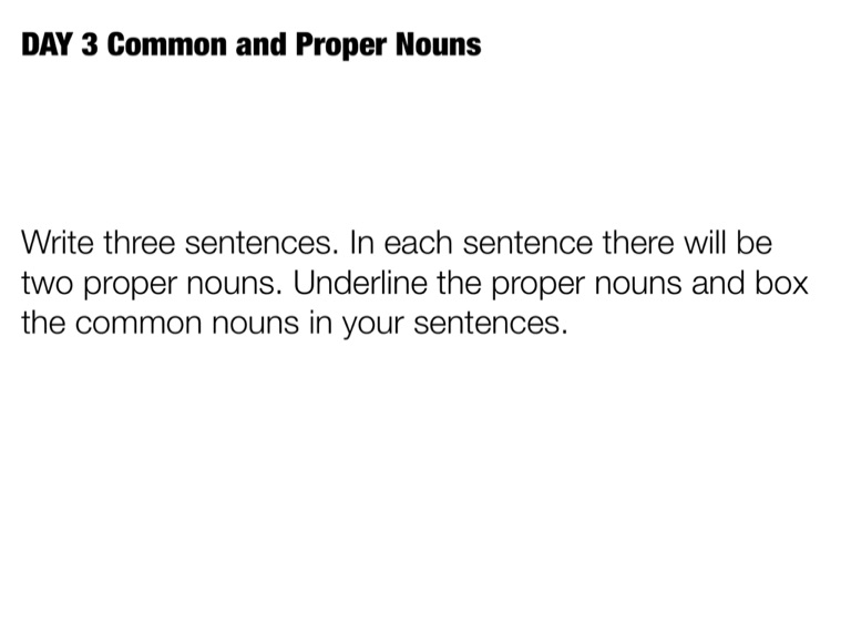 Write three sentences. In each sentence there will be two proper nouns. Underline the proper nouns and box the common nouns in your sentences.