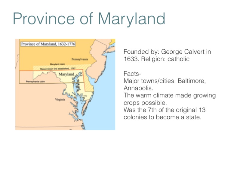 Founded by: George Calvert in 1633. Religion: catholic