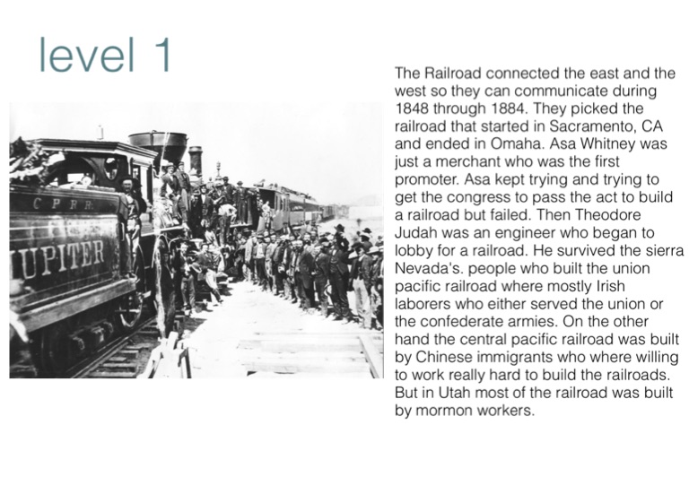 The Railroad connected the east and the west so they can communicate during 1848 through 1884. They picked the railroad that started in Sacramento, CA and ended in Omaha. Asa Whitney was just a merchant who was the first promoter. Asa kept trying and trying to get the congress to pass the act to build a railroad but failed. Then Theodore Judah was an engineer who began to lobby for a railroad. He survived the sierra Nevada's. people who built the union pacific railroad where mostly Irish laborers who either served the union or the confederate armies. On the other hand the central pacific railroad was built by Chinese immigrants who where willing to work really hard to build the railroads. But in Utah most of the railroad was built by mormon workers.
