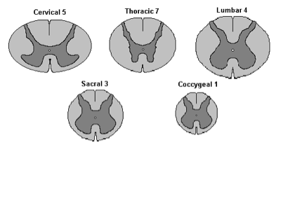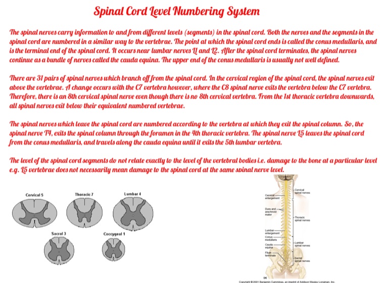 The level of the spinal cord segments do not relate exactly to the level of the vertebral bodies i.e. damage to the bone at a particular level e.g. L5 vertebrae does not necessarily mean damage to the spinal cord at the same spinal nerve level.