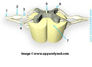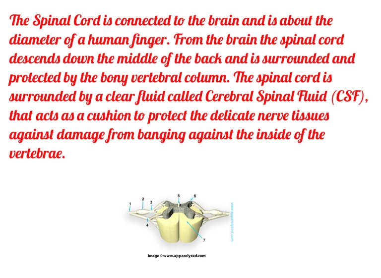 The Spinal Cord is connected to the brain and is about the diameter of a human finger. From the brain the spinal cord descends down the middle of the back and is surrounded and protected by the bony vertebral column. The spinal cord is surrounded by a clear fluid called Cerebral Spinal Fluid (CSF), that acts as a cushion to protect the delicate nerve tissues against damage from banging against the inside of the vertebrae.