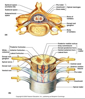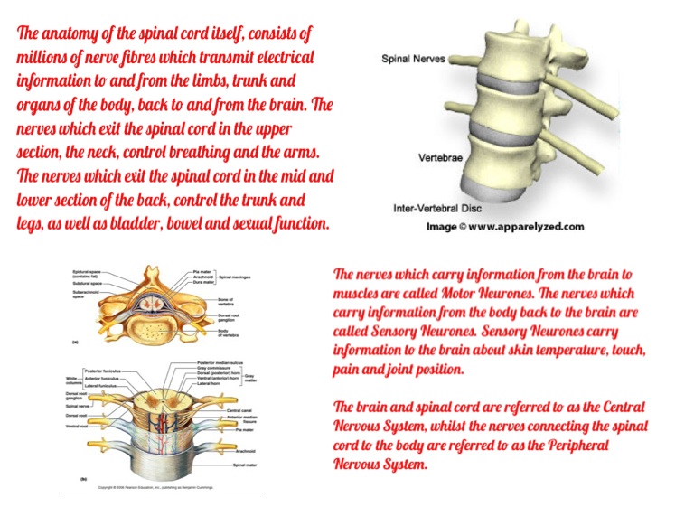 The anatomy of the spinal cord itself, consists of millions of nerve fibres which transmit electrical information to and from the limbs, trunk and organs of the body, back to and from the brain. The nerves which exit the spinal cord in the upper section, the neck, control breathing and the arms. The nerves which exit the spinal cord in the mid and lower section of the back, control the trunk and legs, as well as bladder, bowel and sexual function.