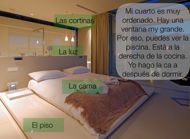 Mi cuarto es muy ordenado. Hay una ventana my grande. Por eso, puedes ver la piscina. Está a la derecha de la cocina. Yo hago la ca a después de dormir.