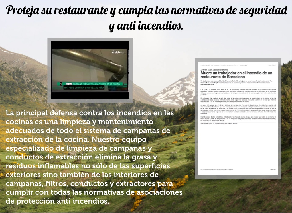 La principal defensa contra los incendios en las cocinas es una limpieza y mantenimiento adecuados de todo el sistema de campanas de extracción de la cocina. Nuestro equipo especializado de limpieza de campanas y conductos de extracción elimina la grasa y residuos inflamables no sólo de las superficies exteriores sino también de las interiores de campanas, filtros, conductos y extractores para cumplir con todas las normativas de asociaciones de protección anti incendios.