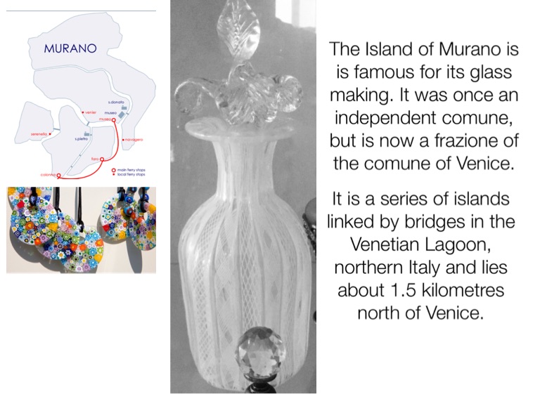 The Island of Murano is is famous for its glass making. It was once an independent comune, but is now a frazione of the comune of Venice.
