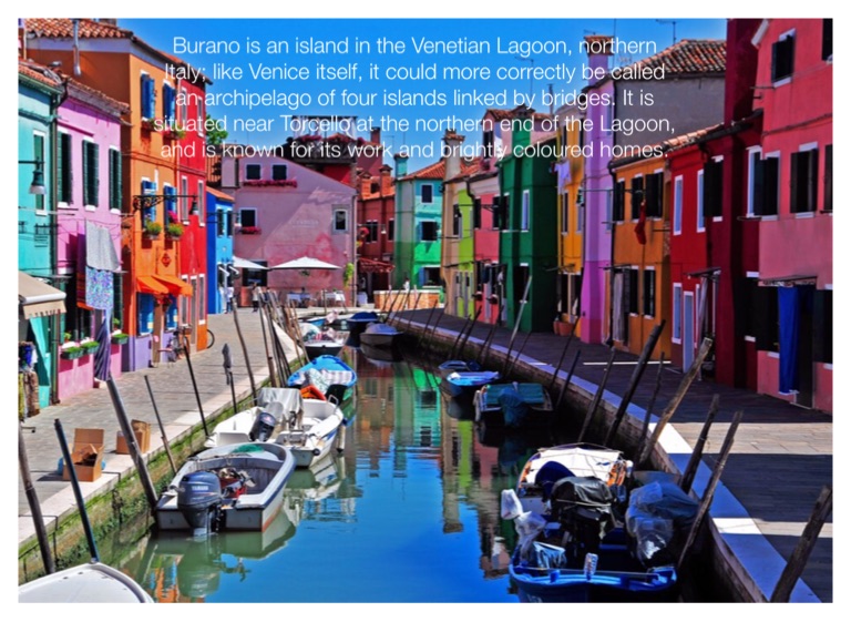 Burano is an island in the Venetian Lagoon, northern Italy; like Venice itself, it could more correctly be called an archipelago of four islands linked by bridges. It is situated near Torcello at the northern end of the Lagoon, and is known for its work and brightly coloured homes.