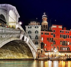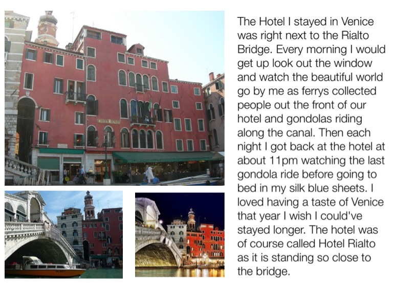 The Hotel I stayed in Venice was right next to the Rialto Bridge. Every morning I would get up look out the window and watch the beautiful world go by me as ferrys collected people out the front of our hotel and gondolas riding along the canal. Then each night I got back at the hotel at about 11pm watching the last gondola ride before going to bed in my silk blue sheets. I loved having a taste of Venice that year I wish I could've stayed longer. The hotel was of course called Hotel Rialto as it is standing so close to the bridge.