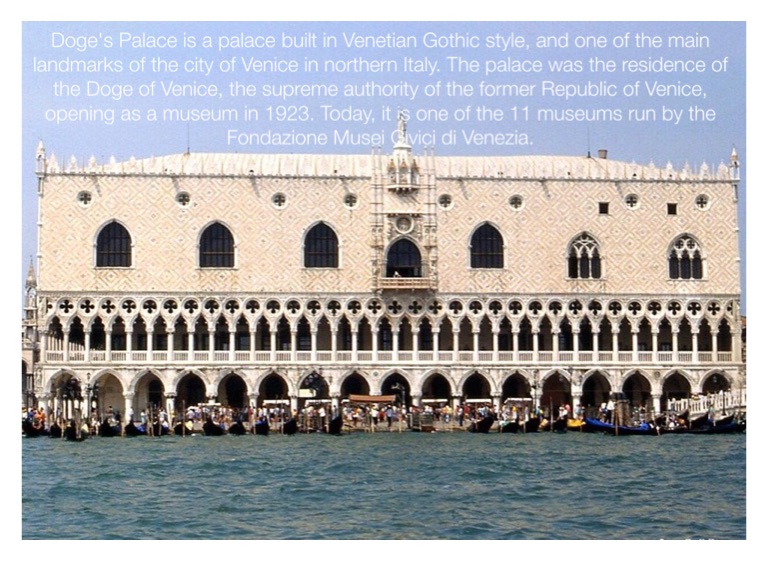Doge's Palace is a palace built in Venetian Gothic style, and one of the main landmarks of the city of Venice in northern Italy. The palace was the residence of the Doge of Venice, the supreme authority of the former Republic of Venice, opening as a museum in 1923. Today, it is one of the 11 museums run by the Fondazione Musei Civici di Venezia.