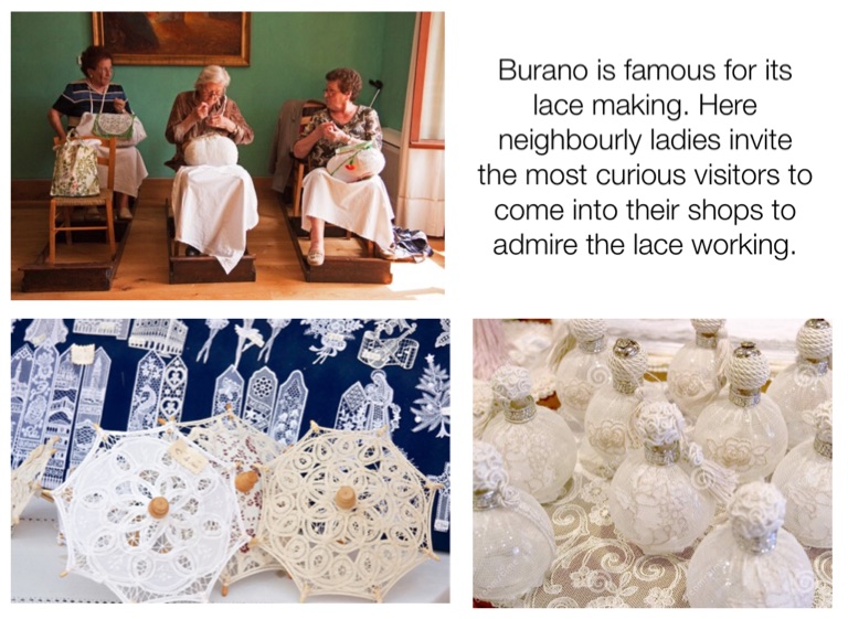 Burano is famous for its lace making. Here neighbourly ladies invite the most curious visitors to come into their shops to admire the lace working.