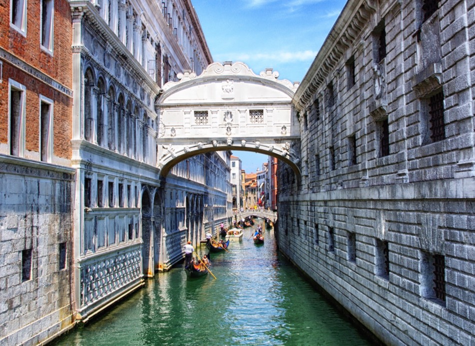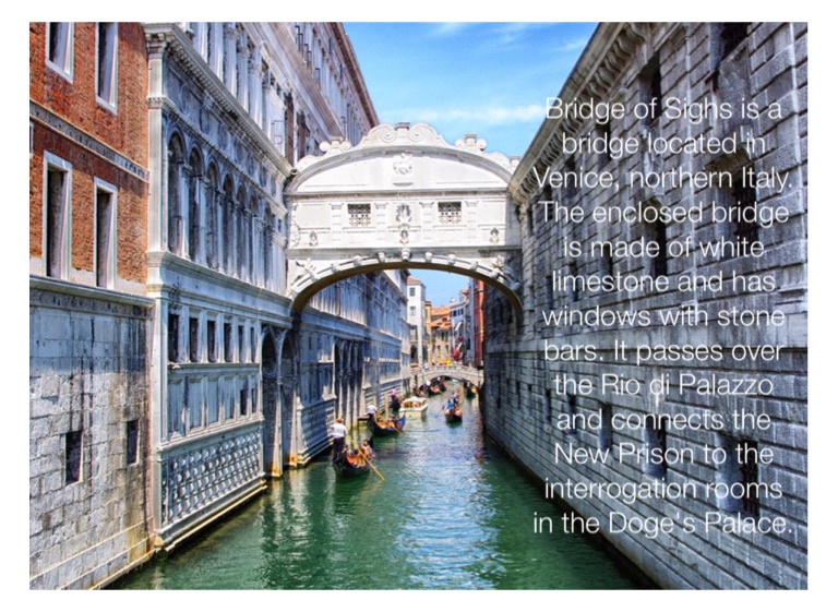 Bridge of Sighs is a bridge located in Venice, northern Italy. The enclosed bridge is made of white limestone and has windows with stone bars. It passes over the Rio di Palazzo and connects the New Prison to the interrogation rooms in the Doge's Palace.