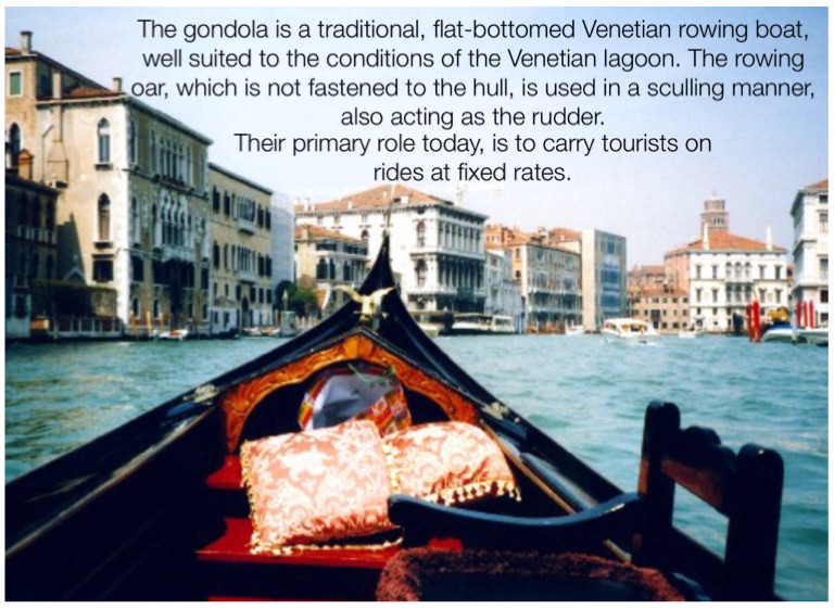 The gondola is a traditional, flat-bottomed Venetian rowing boat, well suited to the conditions of the Venetian lagoon. The rowing oar, which is not fastened to the hull, is used in a sculling manner, also acting as the rudder.
