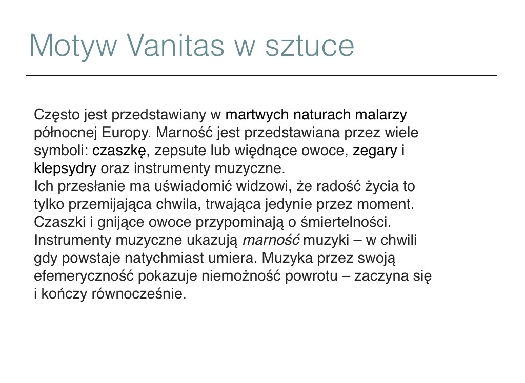 Ich przesłanie ma uświadomić widzowi, że radość życia to tylko przemijająca chwila, trwająca jedynie przez moment. Czaszki i gnijące owoce przypominają o śmiertelności. Instrumenty muzyczne ukazują marność muzyki – w chwili gdy powstaje natychmiast umiera. Muzyka przez swoją efemeryczność pokazuje niemożność powrotu – zaczyna się i kończy równocześnie.