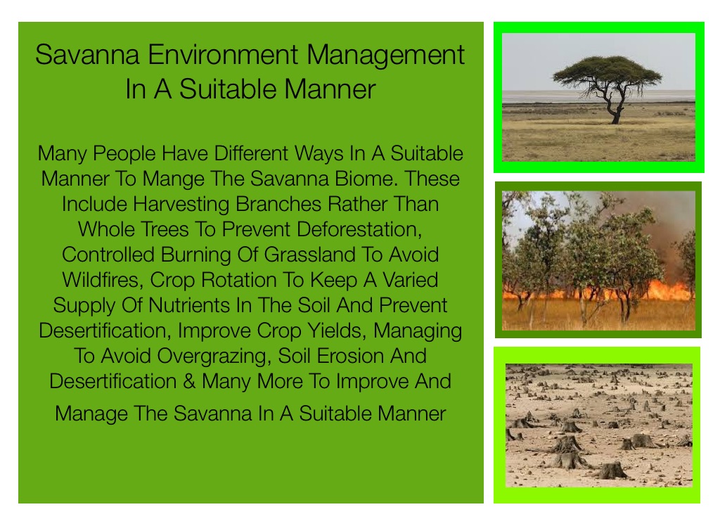 Many People Have Different Ways In A Suitable Manner To Mange The Savanna Biome. These Include Harvesting Branches Rather Than Whole Trees To Prevent Deforestation, Controlled Burning Of Grassland To Avoid Wildfires, Crop Rotation To Keep A Varied Supply Of Nutrients In The Soil And Prevent Desertification, Improve Crop Yields, Managing To Avoid Overgrazing, Soil Erosion And Desertification & Many More To Improve And Manage The Savanna In A Suitable Manner