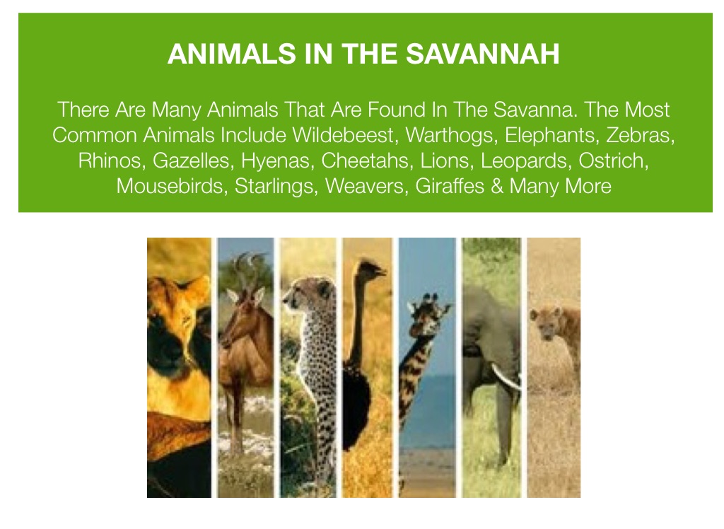 There Are Many Animals That Are Found In The Savanna. The Most Common Animals Include Wildebeest, Warthogs, Elephants, Zebras, Rhinos, Gazelles, Hyenas, Cheetahs, Lions, Leopards, Ostrich, Mousebirds, Starlings, Weavers, Giraffes & Many More