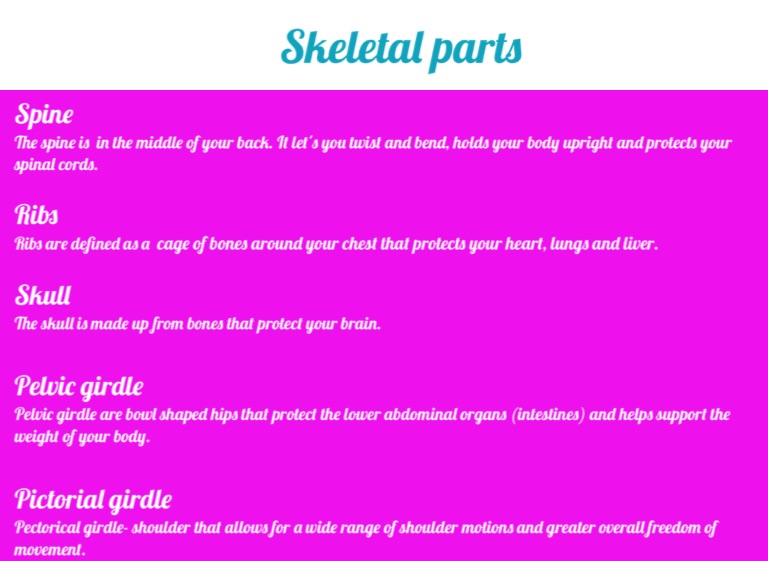 The spine is in the middle of your back. It let's you twist and bend, holds your body upright and protects your spinal cords.