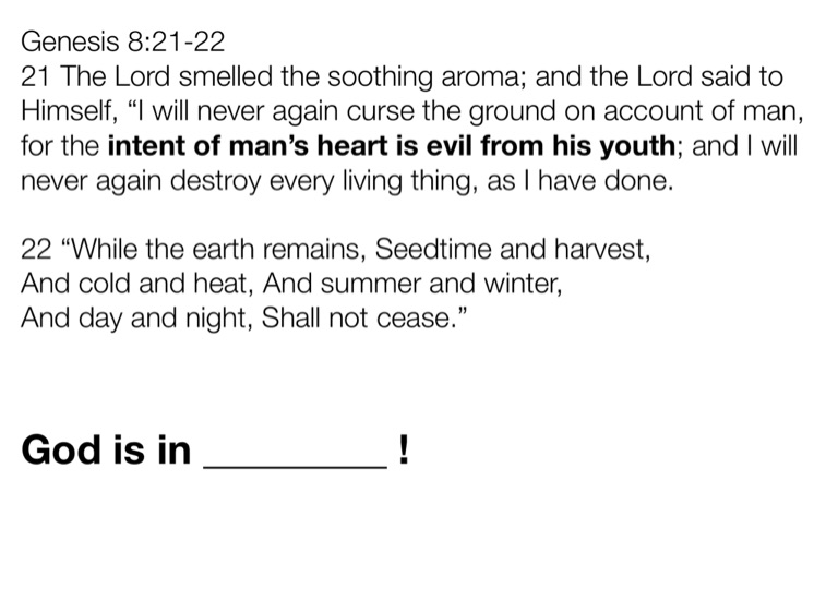 21 The Lord smelled the soothing aroma; and the Lord said to Himself, “I will never again curse the ground on account of man, for the intent of man’s heart is evil from his youth; and I will never again destroy every living thing, as I have done.
