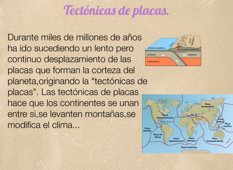 Durante miles de millones de años ha ido sucediendo un lento pero continuo desplazamiento de las placas que forman la corteza del planeta,originando la "tectónicas de placas". Las tectónicas de placas hace que los continentes se unan entre si,se levanten montañas,se modifica el clima...