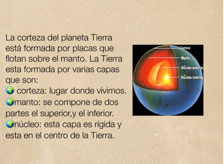 La corteza del planeta Tierra está formada por placas que flotan sobre el manto. La Tierra esta formada por varias capas que son: