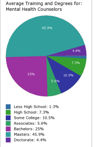 Education : Typically a Master's Degree in psychology, social work or counseling and a license to practice. A Bachelor's Degree is acceptable to enter a master's-level program.