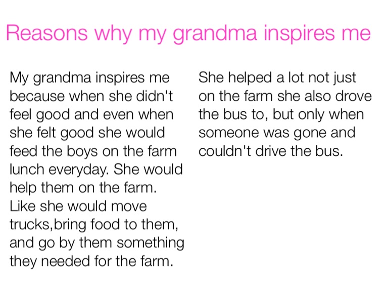 My grandma inspires me because when she didn't feel good and even when she felt good she would feed the boys on the farm lunch everyday. She would help them on the farm. Like she would move trucks,bring food to them, and go by them something they needed for the farm.