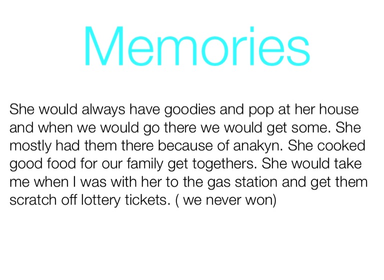 She would always have goodies and pop at her house and when we would go there we would get some. She mostly had them there because of anakyn. She cooked good food for our family get togethers. She would take me when I was with her to the gas station and get them scratch off lottery tickets. ( we never won)