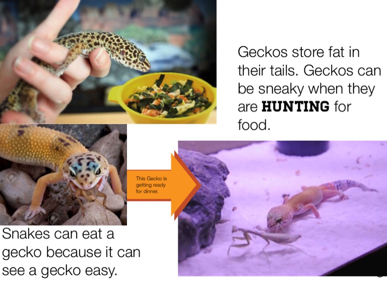 Geckos store fat in their tails. Geckos can be sneaky when they are hunting for food.