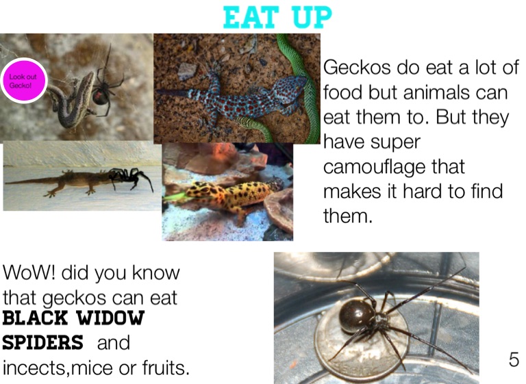 Geckos do eat a lot of food but animals can eat them to. But they have super camouflage that makes it hard to find them.