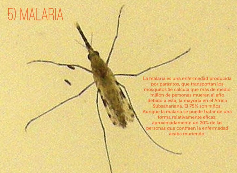 La malaria es una enfermedad producida por parásitos, que transportan los mosquitos.Se calcula que más de medio millón de personas mueren al año debido a ésta, la mayoría en el África Subsahariana. El 75% son niños.