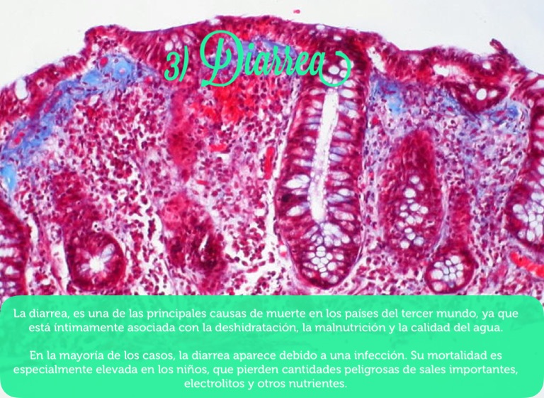 La diarrea, es una de las principales causas de muerte en los países del tercer mundo, ya que está íntimamente asociada con la deshidratación, la malnutrición y la calidad del agua.