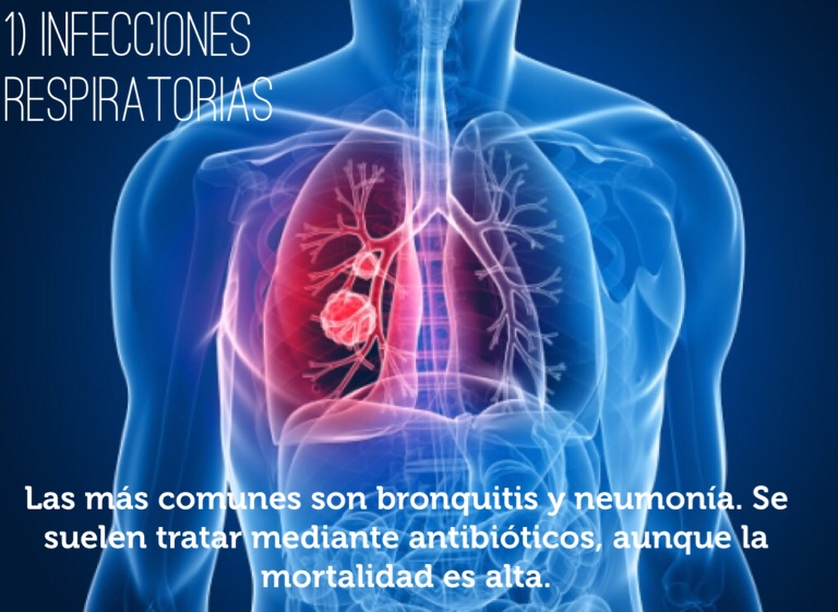 Las más comunes son bronquitis y neumonía. Se suelen tratar mediante antibióticos, aunque la mortalidad es alta.