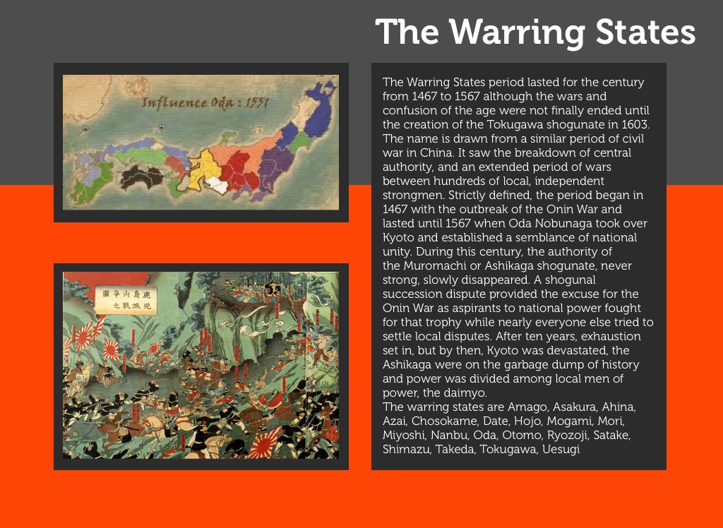 The warring states are Amago, Asakura, Ahina, Azai, Chosokame, Date, Hojo, Mogami, Mori, Miyoshi, Nanbu, Oda, Otomo, Ryozoji, Satake, Shimazu, Takeda, Tokugawa, Uesugi