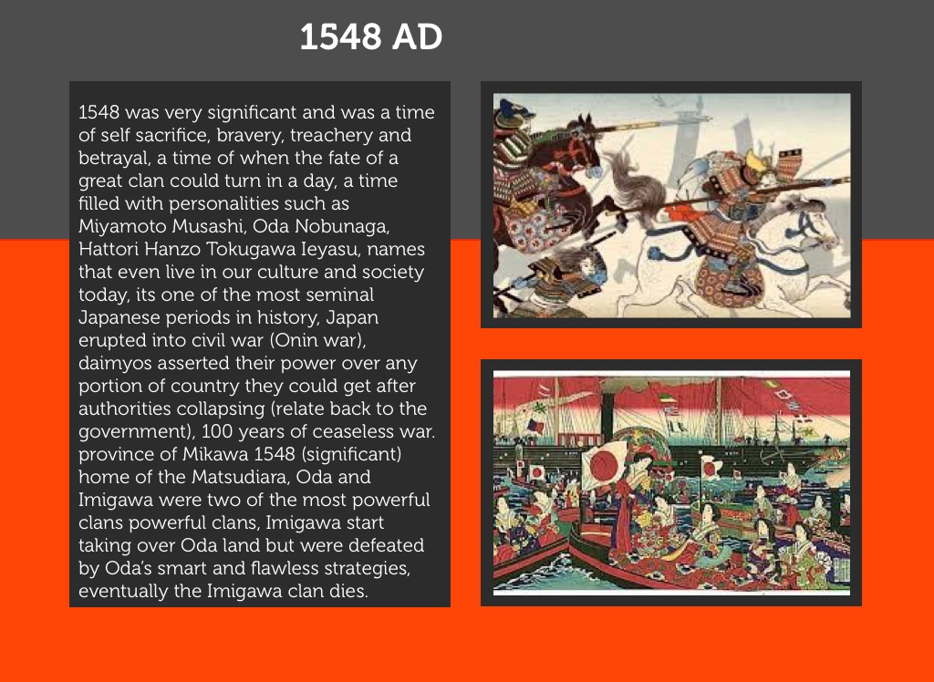1548 was very significant and was a time of self sacrifice, bravery, treachery and betrayal, a time of when the fate of a great clan could turn in a day, a time filled with personalities such as Miyamoto Musashi, Oda Nobunaga, Hattori Hanzo Tokugawa Ieyasu, names that even live in our culture and society today, its one of the most seminal Japanese periods in history, Japan erupted into civil war (Onin war), daimyos asserted their power over any portion of country they could get after authorities collapsing (relate back to the government), 100 years of ceaseless war. province of Mikawa 1548 (significant) home of the Matsudiara, Oda and Imigawa were two of the most powerful clans powerful clans, Imigawa start taking over Oda land but were defeated by Oda’s smart and flawless strategies, eventually the Imigawa clan dies.