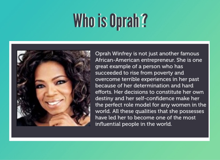 Oprah Winfrey is not just another famous African-American entrepreneur. She is one great example of a person who has succeeded to rise from poverty and overcome terrible experiences in her past because of her determination and hard efforts. Her decisions to constitute her own destiny and her self-confidence make her the perfect role model for any women in the world. All these qualities that she possesses have led her to become one of the most influential people in the world.
