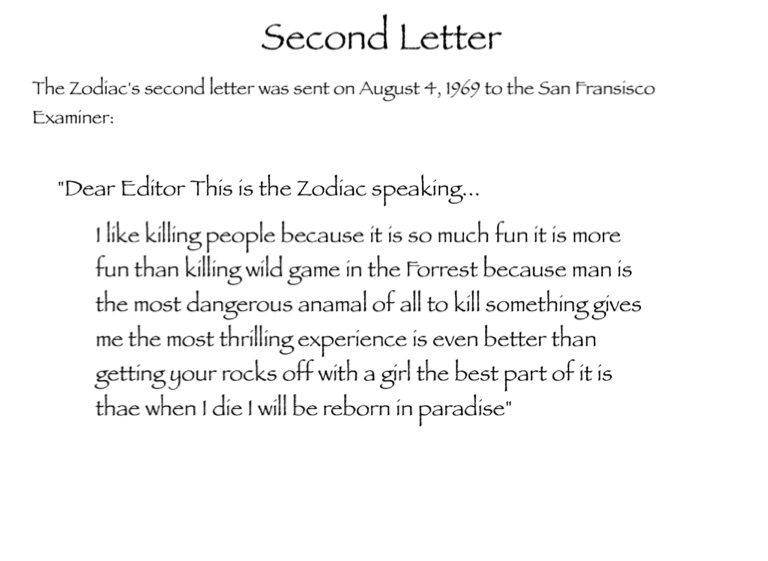 The Zodiac's second letter was sent on August 4, 1969 to the San Fransisco Examiner: