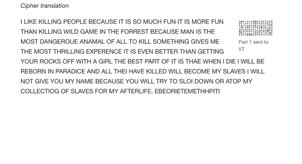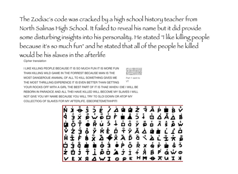 The Zodiac's code was cracked by a high school history teacher from North Salinas High School. It failed to reveal his name but it did provide some disturbing insights into his personality. He stated "I like killing people because it's so much fun" and he stated that all of the people he killed would be his slaves in the afterlife
