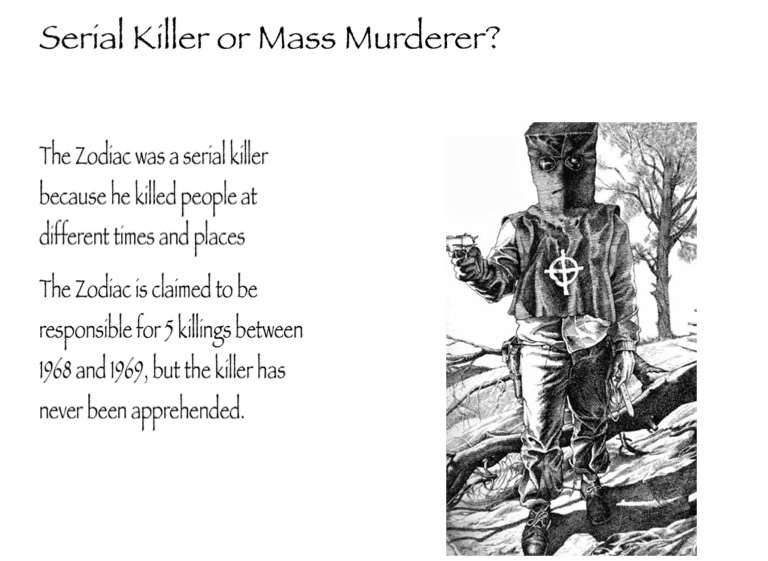 The Zodiac is claimed to be responsible for 5 killings between 1968 and 1969, but the killer has never been apprehended.
