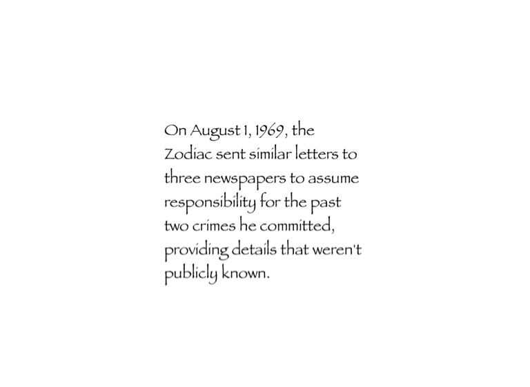 On August 1, 1969, the Zodiac sent similar letters to three newspapers to assume responsibility for the past two crimes he committed, providing details that weren't publicly known.