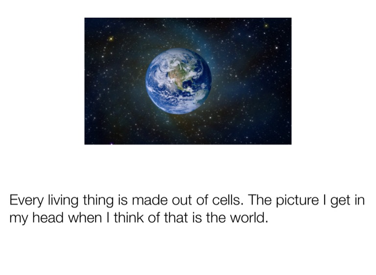Every living thing is made out of cells. The picture I get in my head when I think of that is the world.