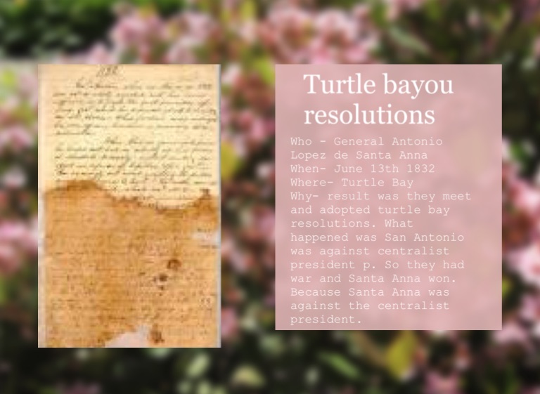 Why- result was they meet and adopted turtle bay resolutions. What happened was San Antonio was against centralist president p. So they had war and Santa Anna won. Because Santa Anna was against the centralist president.