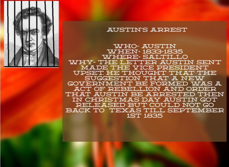 Why- the letter Austin sent made the Vice President upset. He thought that the suggestion that a new government be formed was a act of rebellion and order that Austin be arrested then in Christmas Day Austin got released but could not go back to Texas till September 1st 1835